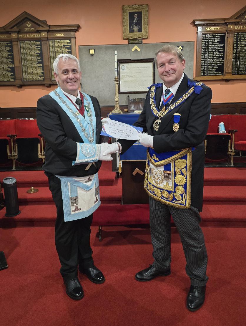 presenting Match funded cheque for Stephens Bike Ride at the Annual Installation of Coquetdale Lodge