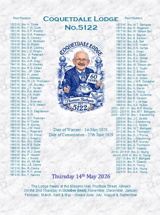 W.Bro. Thomson Bathgate will be celebrating 60 years as a Freemason and 60 years a member of Coquetdale Lodge No.5122 at our May meeting.